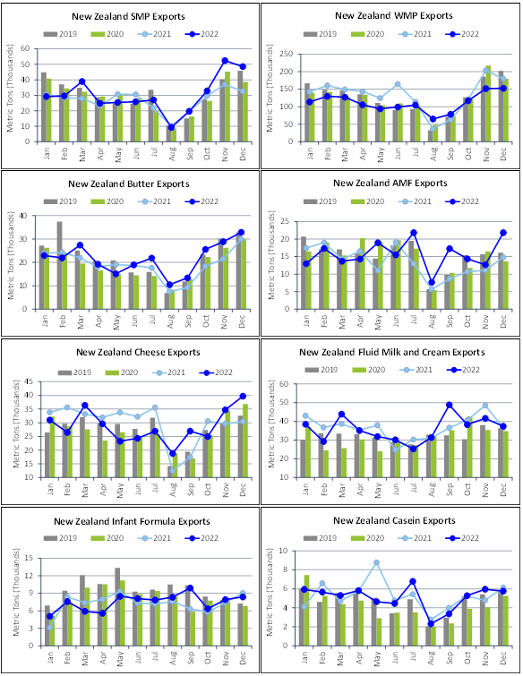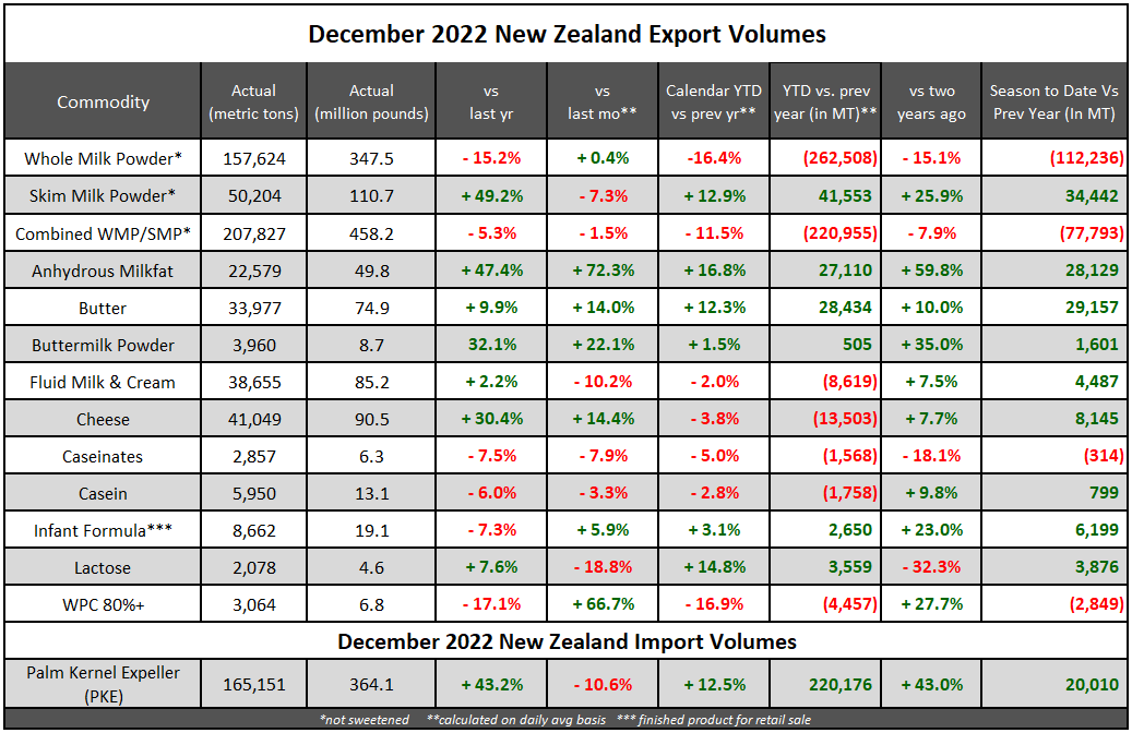- Another record worth noting was that New Zealand’s total cheese exports reached an all-time high in December. The largest jump was shown into China, UP 71% from prior year to 12,076MT – the highest since December 2020. After China and Australia (mentioned above), impressive gains were also observed to South Korea (4,742MT, +66% YoY), followed by Japan (6,791MT, +22% YoY). Shipments to South Korea were the highest to the country on record.