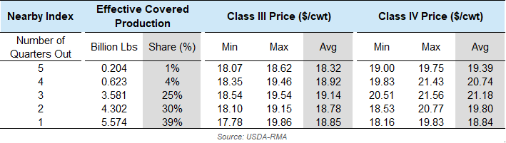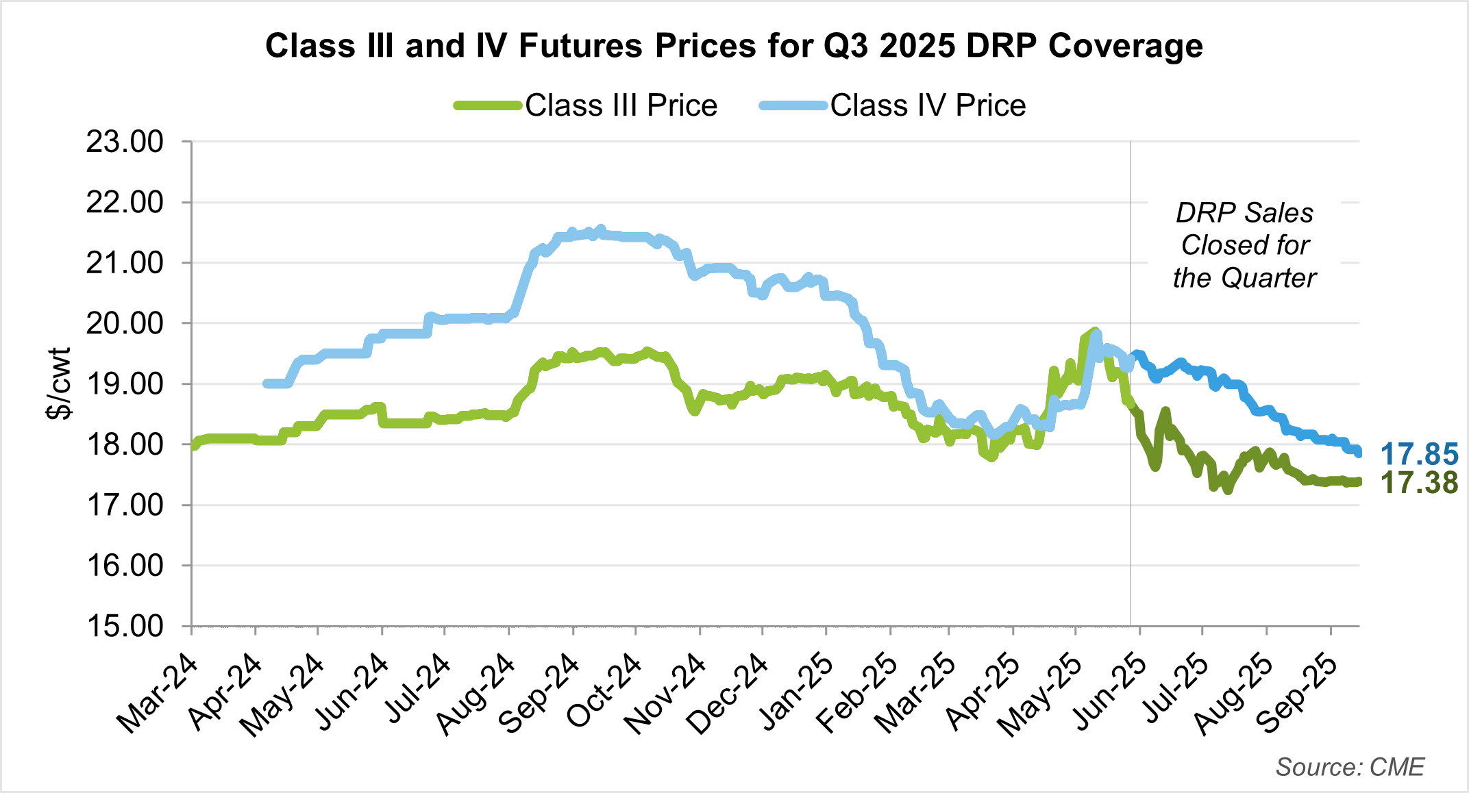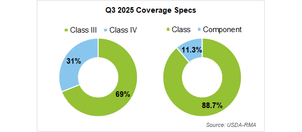 - If ignoring yield adjustment factors (YAF), indemnities for Q3 2025 would have triggered for both Class III and Class IV class pricing endorsements. Class III prices settled below the 95% coverage level on 200 out of 263 days (76% of the time), while Class IV prices settled below the 95% coverage level on 194 out of 242 days (80% of the time).