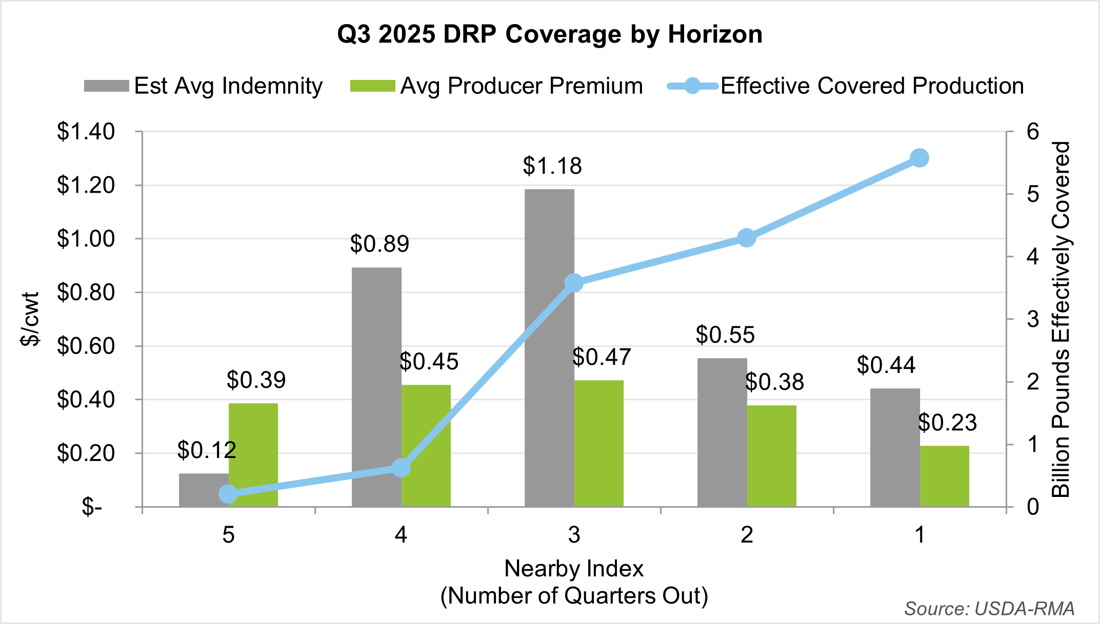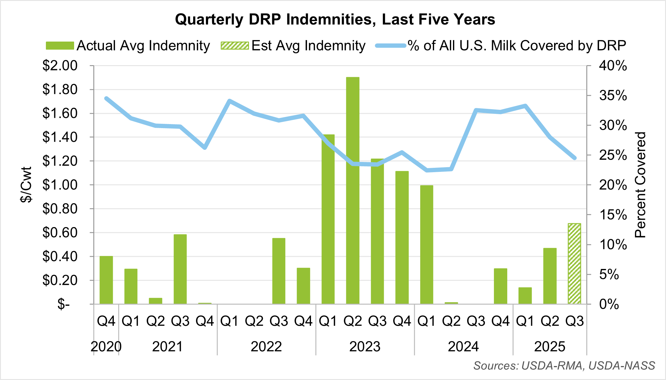- Estimated indemnities for Q3 2025 averaged $0.68/cwt. After factoring in producer premiums, which averaged $0.35/cwt, the estimated net return to producers was +$0.33/cwt.