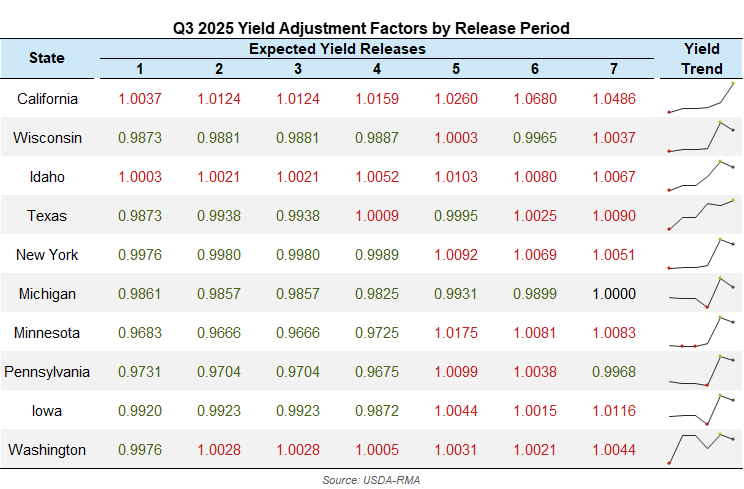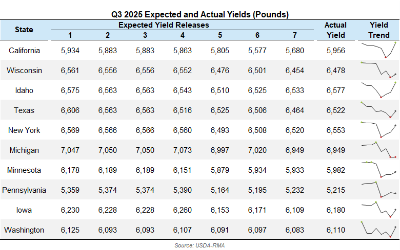 - With strong milk yields across most dairy regions, actual production outperformed earlier expectations, especially those closer to the coverage closing date. While most states experienced only modest impacts, California’s yield adjustment factors (YAFs) were particularly detrimental to DRP settlements. Following the bird flu outbreak in late 2024, the DRP yield model was skewed toward reduced production expectations for California, leading to a negative adjustment to expected yields. Contrary to the model, milk output rebounded and increased through Q3 2025, with actual yields coming in 1.2% to 6.8% higher than expected yields. This resulted in a boost to actual revenue, substantially reducing projected losses in that state.