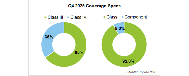 • Ignoring yield adjustment factors (YAFs), both Class III and Class IV class pricing endorsements would have triggered indemnities in Q4 2025, as dairy prices fell significantly over the period. Class III prices settled below the 95% coverage level on 250 out of 258 days (97% of the time), while Class IV prices settled below the 95% coverage level on every available day.