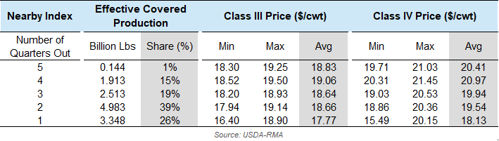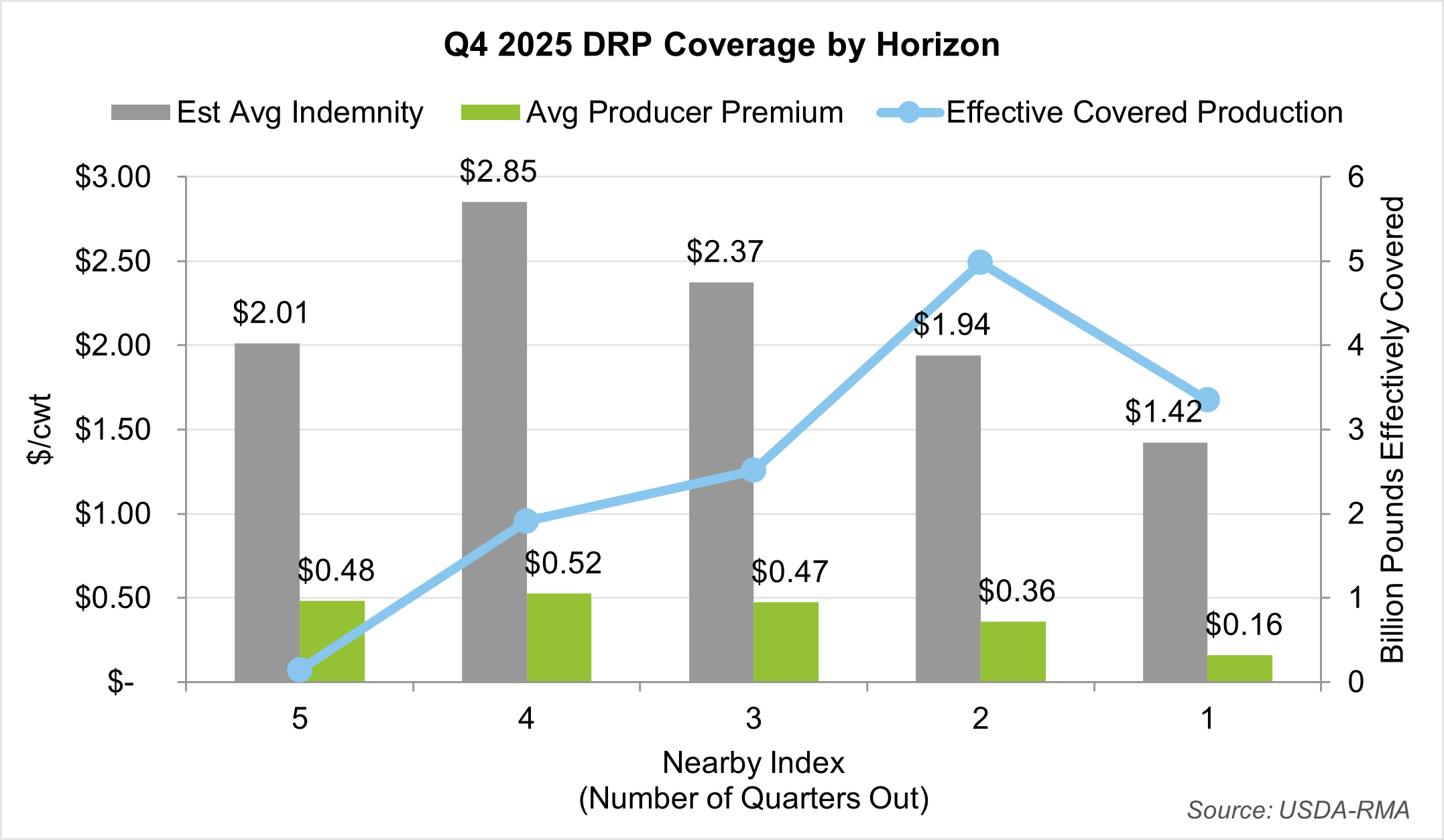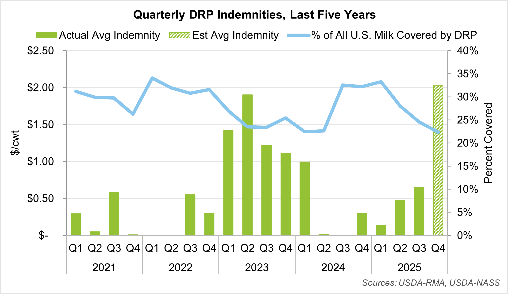 At the time of publishing, Q4 2025 indemnities had not yet been released by USDA-RMA. As such, the most recent quarter’s indemnity payments in this report are estimated using announced class and component prices and milk yields.