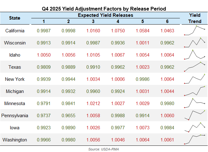 The Yield Adjustment Factor (YAF) is calculated as the state or pooled production region’s actual yield released in USDA’s Milk Production report divided by the expected yield at the time of coverage. The YAF can have a positive or negative impact on indemnity payments:
