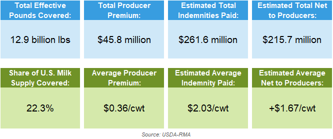 Net to producers is equal to the indemnity paid minus the producer premium. Effective covered milk production is equal to the declared production times the protection factor. Class III versus IV coverage is calculated as the effective covered milk production times the class price weighting factor or the component price weighting factor.