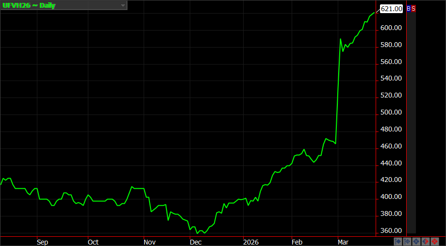 These combined disruptions across both nitrogen and phosphate supply chains are now showing up clearly in pricing. Since the war’s onset, fertilizer prices have surged. For example, the March 2026 Urea (Granular) FOB US Gulf futures contract was at $465.50/MT on February 27, the day before the war began, and has since climbed to $621/MT as of March 23 — a 33% increase in less than a month (Figure 3).