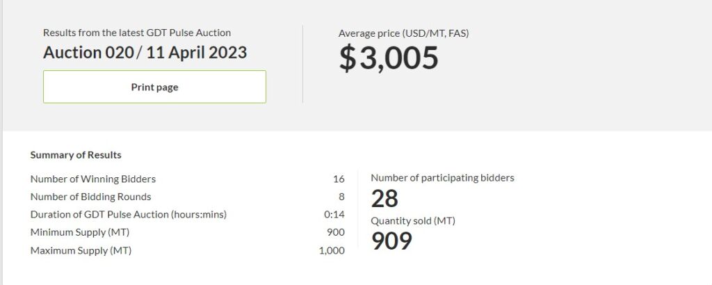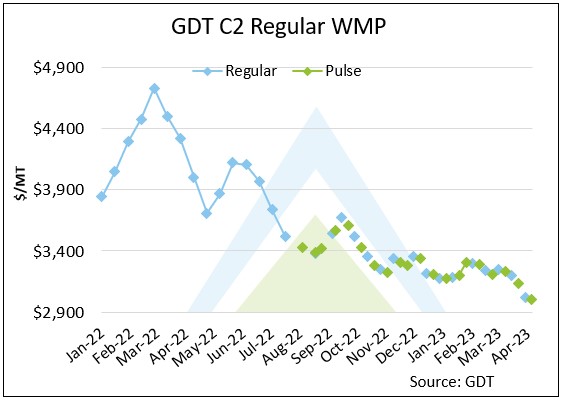 - C2 (June ’23) Regular WMP – $3,005/MT, DOWN 0.5% or -$15/MT vs. last week’s GDT Auction on 4 April.