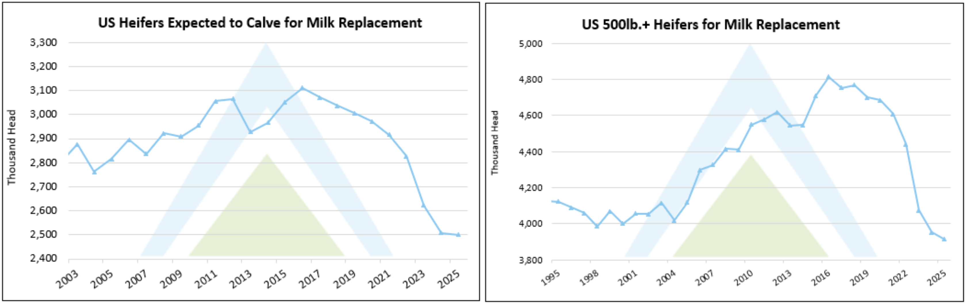 One of the most anticipated figures was the dairy heifer numbers, and inventories remained historically small. Dairy heifers expected to calve totaled 2.5 million head as of January 1, 2025, down 0.4% from the previous year and the lowest level since the dataset began in 2001. The figures for 2023, 2024, and 2025 now represent the three lowest readings in the 25-year history of the dataset. Dairy heifers weighing 500 pounds or more, including those expected to calve, totaled 3.914 million head, a decline of 0.9% year-over-year and the smallest value since 1978. In addition, USDA made downward revisions to the 2024 values for these data points, decreasing heifers expected to calve by 84,500 head (-3.4% of actual) and dropping total dairy heifers by 108,000 (-2.7% of actual). These shrinking figures highlight the ongoing trend of dairy farmers breeding cows to beef bulls, rather than dairy bulls, to produce higher-value crossbred calves that can be sold at a few days old for a nice price.