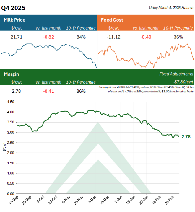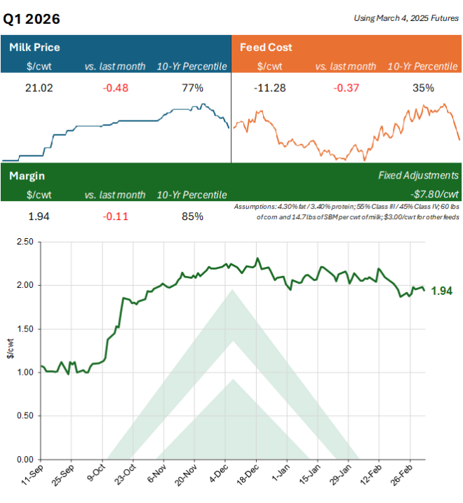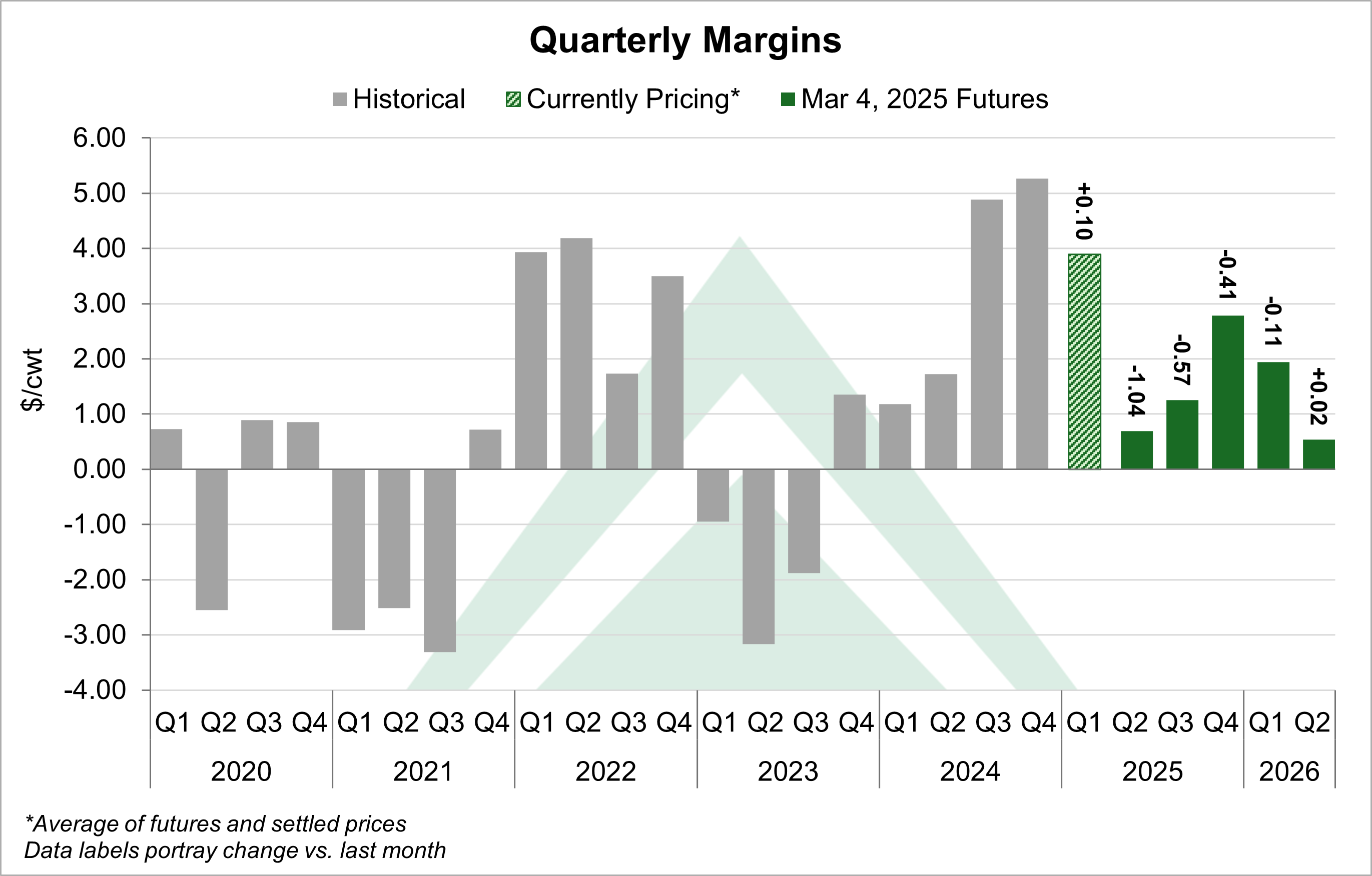 Assumptions: All projections are estimated on an accrual basis. Quarterly margins are determined using current CME futures prices for dairy products, corn, and soybean meal. Milk prices are derived from CME dairy product futures and adjusted for component levels and class utilization. Assumed component levels by quarter are: 4.30% BF / 3.40% PRO in Q1 & Q4 and 4.00% BF / 3.20% PRO in Q2 & Q3. Component estimates are based on recent data available for milk composition levels across the US. Class utilization is set to 55% Class III / 45% Class IV. Feed costs are calculated using CME corn and soybean meal futures (“correlated feeds”) and a fixed value for non-correlated feeds at $3.00/cwt. Correlated feed costs are based on the assumption that 60 lbs of corn (or its equivalents) and 14.7 lbs of soybean meal (or its equivalents) are required to produce 100 lbs of milk. A basis adjustment of +$1.00/bushel is added to corn futures, and no basis is added to soybean meal futures. The remaining adjustments are fixed at: -$8.00/cwt for total non-feed costs; -$1.30/cwt for milk check premiums/deductions; and +$1.50 for non-milk revenue.