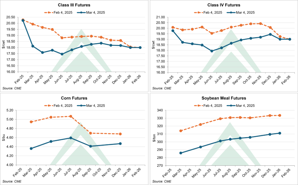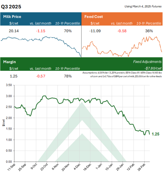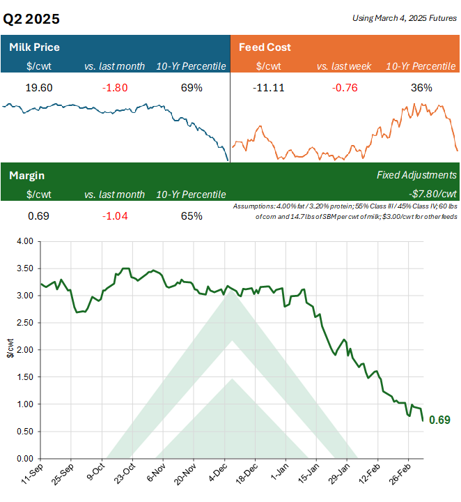 With significant declines observed in Class III and Class IV futures, nearby margins fell. HighGround’s Q2 2025 margin estimate dropped $1.04/cwt during the past month, resulting in a margin of $0.69/cwt. Despite a strong decrease in feed costs, the milk price projection fell $1.80/cwt for Q2, driving margin estimates lower.