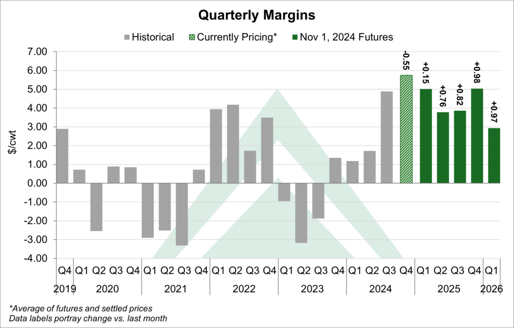 • Despite declining $0.55/cwt from a month ago, Q4 2024 margins are currently pricing at some of the highest levels observed in the past 10 years. As of November 1, HighGround’s Q4 2024 average margin projection is around $5.74/cwt.