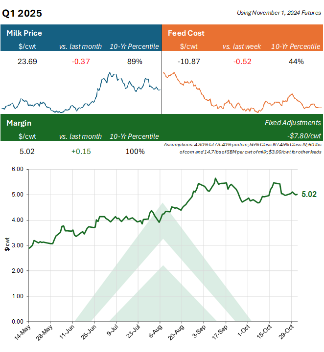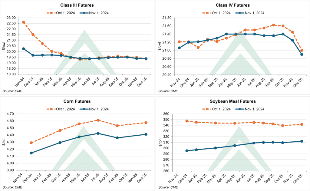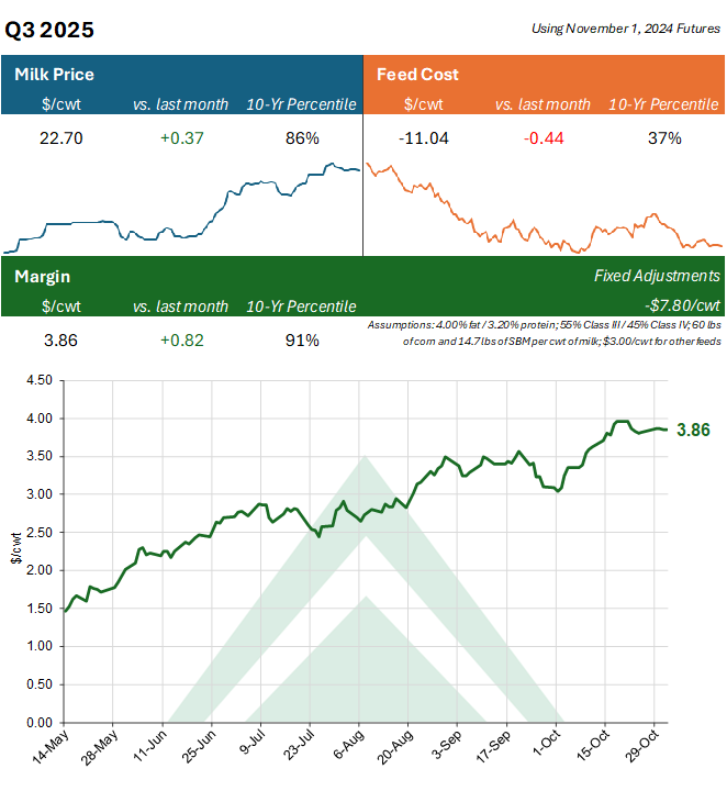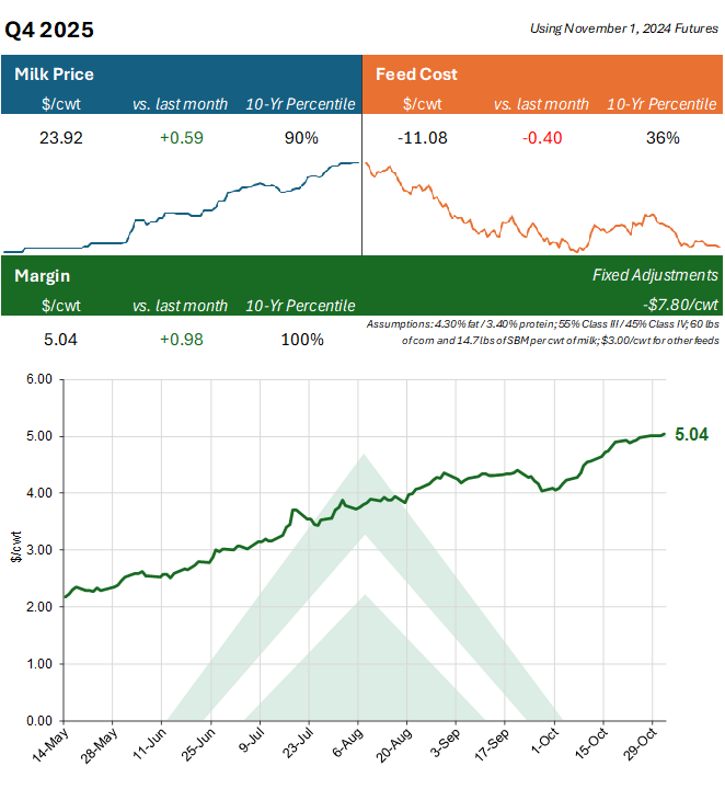 • With dry conditions across most of the corn belt, the 2024 harvest has been a quick one, with over 80% of corn and soybeans harvested as of October 27. As combines have hit the fields, markets have seen further confirmation of this year’s bumper crops, putting additional pressure on corn and soybean meal futures. Margin projections for 2025 improved from last month on these lower feed costs, while milk prices rose in Q2 2025 and beyond.