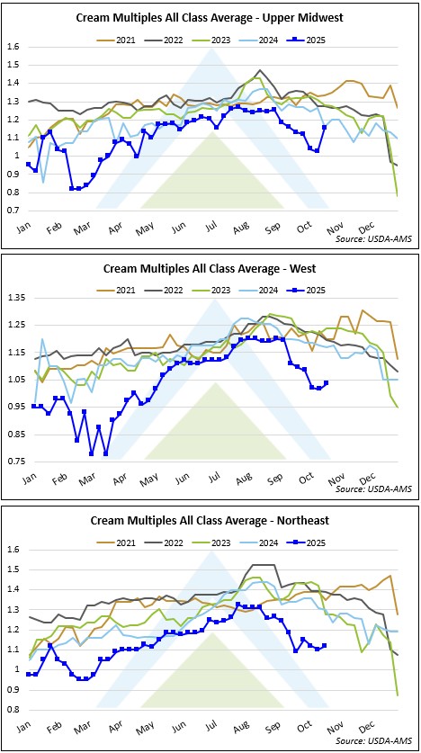The USDA reports in the Central region, milk output is steady, but contacts say volumes remain up from a year ago. Class I demand is strong and some manufacturers in the region say they are moving volumes to other regions to help meet bottling demands. Demand from Class II plants is picking up. Cheesemakers are running steady to lighter schedules, and some say they are selling spot loads of milk to other cheesemakers nearby, while others are moving volumes to Class I production. Spot demand for Class III milk remains light as cheesemakers in the region say they are utilizing volumes from within their network, rather than purchasing spot loads. Prices for Class III milk are down from last week, ranging from $0.25 under to $2.00-over. Milk components are increasing in the region, contributing to strong cream production. Cream is available in the region. Demand for cream from butter makers is softer this week, as some plants have downtime for maintenance. Class II cream demand is increasing though, which some contacts say is contributing to higher cream multiples this week.