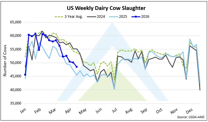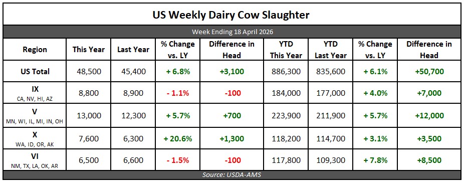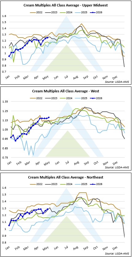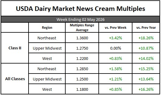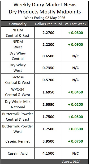 The USDA reports in the Central region milk production is steady, and contacts say output was up year over year in April. Processors are running busy schedules, and contacts say this is keeping spot volumes from becoming excessive. Demand for Class I milk is strong, though contacts note bottling will start to decline in May as the school year ends and educational institutions go on break for the summer. Class II demand is strong, and manufacturers are running busy schedules, as they try to keep up with strong market demand. Cheesemakers are running busy schedules but say they are primarily using volumes from within their networks for production, and they are purchasing few spot loads of milk. Reported prices for Class III milk range from $5-under to flat class this week. Demand for Class IV milk remains strong. Contacts say cream production is strong in the region. Class II and III processors are pulling in large volumes of cream, keeping spot inventories well balanced. Demand for cream for churning is light, as butter makers are using volumes from within their network to run full production schedules.